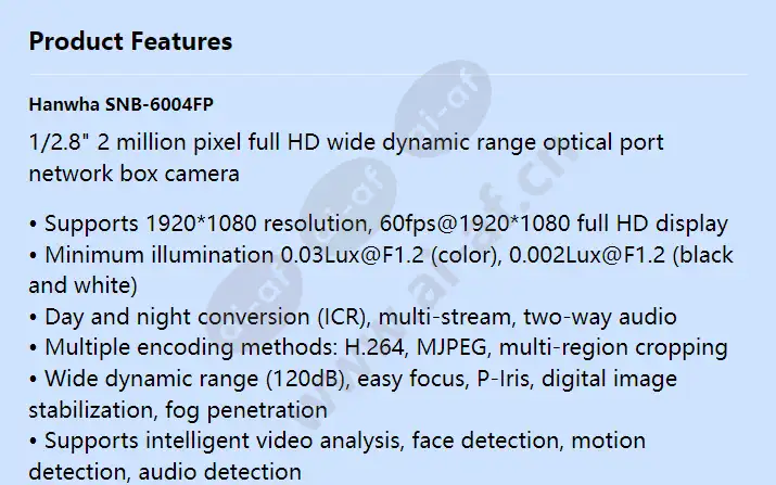 Hanwha SNB-6004FP 1/2.8" 2 million pixel full HD wide dynamic range optical port network box camera • Supports 1920*1080 resolution, 60fps@1920*1080 full HD display • Minimum illumination 0.03Lux@F1.2 (color), 0.002Lux@F1.2 (black and white) • Day and night conversion (ICR), multi-stream, two-way audio • Multiple encoding methods: H.264, MJPEG, multi-region cropping • Wide dynamic range (120dB), easy focus, P-Iris, digital image stabilization, fog penetration • Supports intelligent video analysis, face detection, motion detection, audio detection • Support micro SD/SDHC/SDXC, NAS network storage • SFP LC type, 1000Mbps default rate