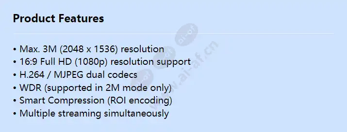 • Max. 3M (2048 x 1536) resolution • 16:9 Full HD (1080p) resolution support • H.264 / MJPEG dual codecs • WDR (supported in 2M mode only) • Smart Compression (ROI encoding) • Multiple streaming simultaneously