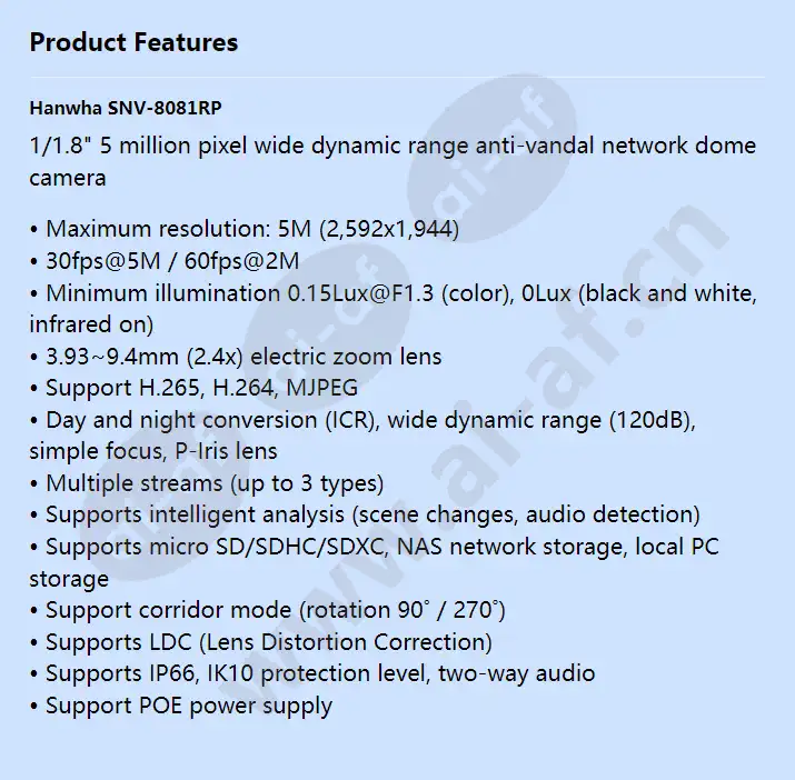Hanwha SNV-8081RP 1/1.8" 5 million pixel wide dynamic range anti-vandal network dome camera • Maximum resolution: 5M (2,592x1,944) • 30fps@5M / 60fps@2M • Minimum illumination 0.15Lux@F1.3 (color), 0Lux (black and white, infrared on) • 3.93~9.4mm (2.4x) electric zoom lens • Support H.265, H.264, MJPEG • Day and night conversion (ICR), wide dynamic range (120dB), simple focus, P-Iris lens • Multiple streams (up to 3 types) • Supports intelligent analysis (scene changes, audio detection) • Supports micro SD/SDHC/SDXC, NAS network storage, local PC storage • Support corridor mode (rotation 90˚ / 270˚) • Supports LDC (Lens Distortion Correction) • Supports IP66, IK10 protection level, two-way audio • Support POE power supply