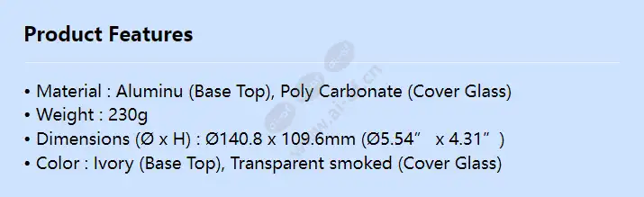 • Material : Aluminu (Base Top), Poly Carbonate (Cover Glass) • Weight : 230g • Dimensions (Ø x H) : Ø140.8 x 109.6mm (Ø5.54” x 4.31”) • Color : Ivory (Base Top), Transparent smoked (Cover Glass)