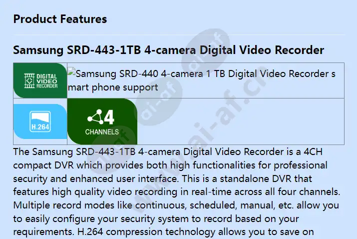Samsung SRD-443-1TB 4-camera Digital Video Recorder The Samsung SRD-443-1TB 4-camera Digital Video Recorder is a 4CH compact DVR which provides both high functionalities for professional security and enhanced user interface. This is a standalone DVR that features high quality video recording in real-time across all four channels. Multiple record modes like continuous, scheduled, manual, etc. allow you to easily configure your security system to record based on your requirements. H.264 compression technology allows you to save on storage space while also minimizing the bandwidth requirement for operations. This Samsung SRD-443-1TB 4-camera Digital Video Recorder is not only extremely easy to install and configure but also simple to operate with its intuitive GUI. Simply installing the