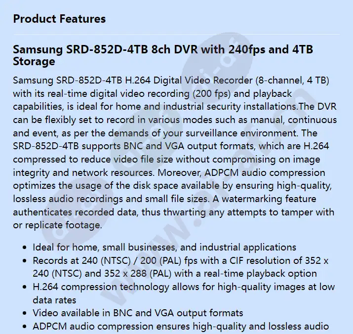 Samsung SRD-852D-4TB 8ch DVR with 240fps and 4TB Storage Samsung SRD-852D-4TB H.264 Digital Video Recorder (8-channel, 4 TB) with its real-time digital video recording (200 fps) and playback capabilities, is ideal for home and industrial security installations.The DVR can be flexibly set to record in various modes such as manual, continuous and event, as per the demands of your surveillance environment. The SRD-852D-4TB supports BNC and VGA output formats, which are H.264 compressed to reduce video file size without compromising on image integrity and network resources. Moreover, ADPCM audio compression optimizes the usage of the disk space available by ensuring high-quality, lossless audio recordings and small file sizes. A watermarking feature authenticates recorded data, thus thwarting