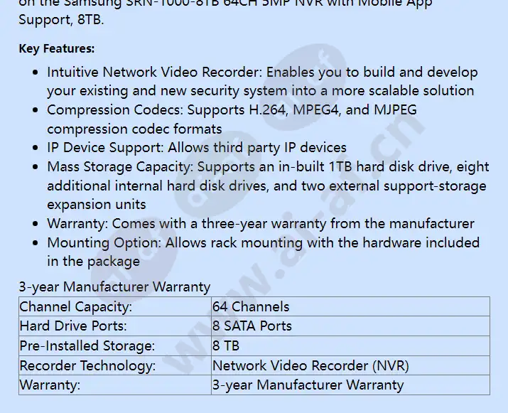 Samsung SRN-1000-8TB Network Video Recorder - 8TB Install the Samsung SRN-1000-8TB 64CH 5MP NVR with Mobile App Support, 8TB to support your surveillance system. This network video recorder supports 64 camera channels and has the capacity to record 100Mbps of video bandwidth. Enjoy a wide-angle resolution range from VGA to 5 megapixels. You have the option to record in high definition or megapixels format. This network enabled video recorder helps you to build and develop new or existing security system into a larger network, an ideal solution for large establishments. This NVR has a huge storage capacity that is expandable up to 48TB per SRN-1000. You can store your feeds in the 1TB in-built internal hard disk drive. Additionally, there are eight extra internal hard disk drives and two
