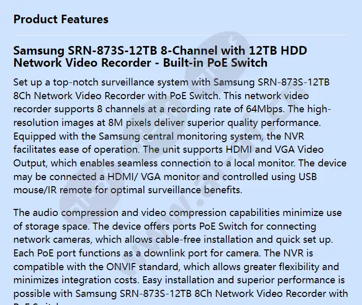 Samsung SRN-873S-12TB 8-Channel with 12TB HDD Network Video Recorder - Built-in PoE Switch Set up a top-notch surveillance system with Samsung SRN-873S-12TB 8Ch Network Video Recorder with PoE Switch. This network video recorder supports 8 channels at a recording rate of 64Mbps. The high-resolution images at 8M pixels deliver superior quality performance. Equipped with the Samsung central monitoring system, the NVR facilitates ease of operation. The unit supports HDMI and VGA Video Output, which enables seamless connection to a local monitor. The device may be connected a HDMI/ VGA monitor and controlled using USB mouse/IR remote for optimal surveillance benefits. The audio compression and video compression capabilities minimize use of storage space. The device offers ports PoE Switch for