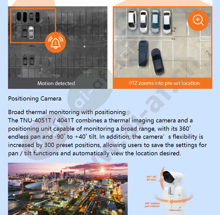 • Max. 640 x 480 resolution support • Built-in 19mm fixed lens • H.265, H.264, MJPEG codec • Max. 30fps@all resolutions (H.265, H.264, MJPEG) • Motion detection, Handover, Tampering, Loitering • Directional detection, Audio detection, Sound classification • Shock detection,Temperature detection, Hallway view • SD / SDHC / SDXC memory slot (Max. 256GB) • WiseStreamII support • PoE, 24V AC, 12V DC • IP66, NEMA4X, IK10 Seeing Beyond Sight VGA Thermal network camera Max. 640 x 480 resolution support H.265, H.264, MJPEG codec Max. 30fps@all resolutions (H.265, H.264, MJPEG) WiseStream II support Video & Audio Analytics Motion detection, Handover SD / SDHC / SDXC memory slot (Max. 256GB) IP66, NEMA4X, IK10 (TNO-4041T / 4041TR / 4040T / 4040TR / 4030T / 4030TR, TNU-4041T) Bullet Camera TNO-4051T