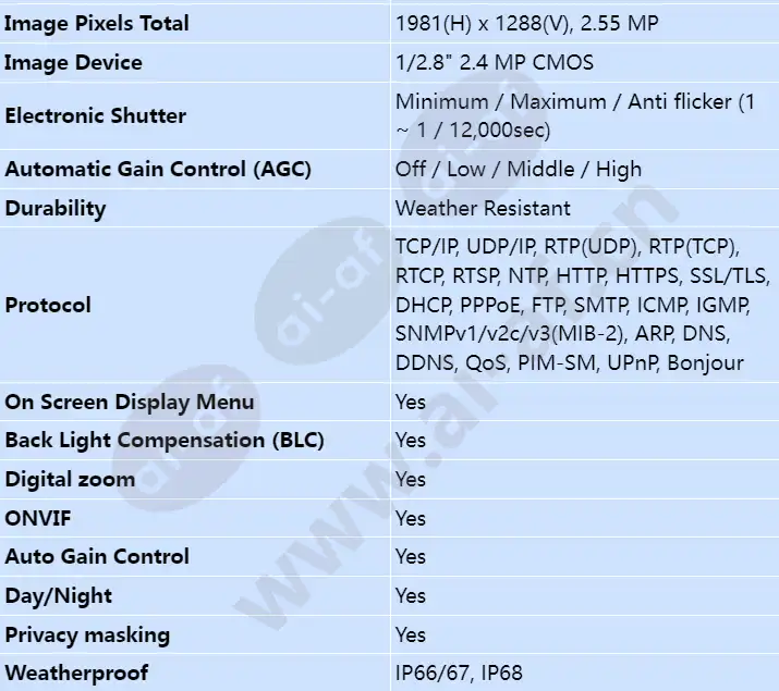 1080p @ 60fps 32x optical zoom with auto focus Multiple streaming Intelligent video analytics, wiper, fiber Wide Dynamic Range (125dB) Built-in dual micro SD/SDHC/SDXC memory slots 110VAC Power Features Auto Gain Control, Automatic White Balance, Back Light Compensation, Day/Night, Digital Noise Reduction, Digital Zoom, Flickerless, Motion Detection Tracking, On Screen Display Menu, ONVIF, Privacy Masking, Weather Resistant, Wide Dynamic Range Scanning System Progressive scan S/N Ratio 50dB Protocols TCP/IP, UDP/IP, RTP(UDP), RTP(TCP), RTCP, RTSP, NTP, HTTP, HTTPS, SSL/TLS, DHCP, PPPoE, FTP, SMTP, ICMP, IGMP, SNMPv1/v2c/v3(MIB-2), ARP, DNS, DDNS, QoS, PIM-SM, UPnP, Bonjour Privacy Zone 24 Zones of rectangle zone Power Consumption 37W Maximum OSD Menu English, Korean, Chinese, French
