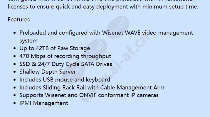 The WRR-P-E200L-36TB from Samsung is a 1U Wisenet WAVE NVR with 4 Professional Licenses, 36TB.The WRR-P-E200 series offers an affordable and reliable shallow depth 1U rackmount solution for any entry-level deployment. Up to 42TB of raw video-optimized storage is provided by 24/7 duty cycle SATA drives. The latest Intel® Xeon® E-2124 Processor allows for high powered computing power, and 16GB of DDR4 RAM provides the system resources to scale as needed. A dedicated solid state drive for applications and the operating system enables fast boot and load times. The fiveyear, on-site, Next Business Day, Keep Your Hard Drive warranty ensures peace of mind. Each server is pre-configured with Wisenet WAVE VMS and preloaded with 4 Professional licenses to ensure quick and easy deployment with