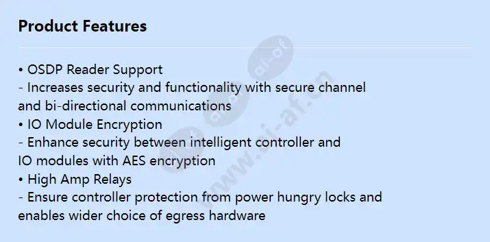 • OSDP Reader Support - Increases security and functionality with secure channel and bi-directional communications • IO Module Encryption - Enhance security between intelligent controller and IO modules with AES encryption • High Amp Relays - Ensure controller protection from power hungry locks and enables wider choice of egress hardware