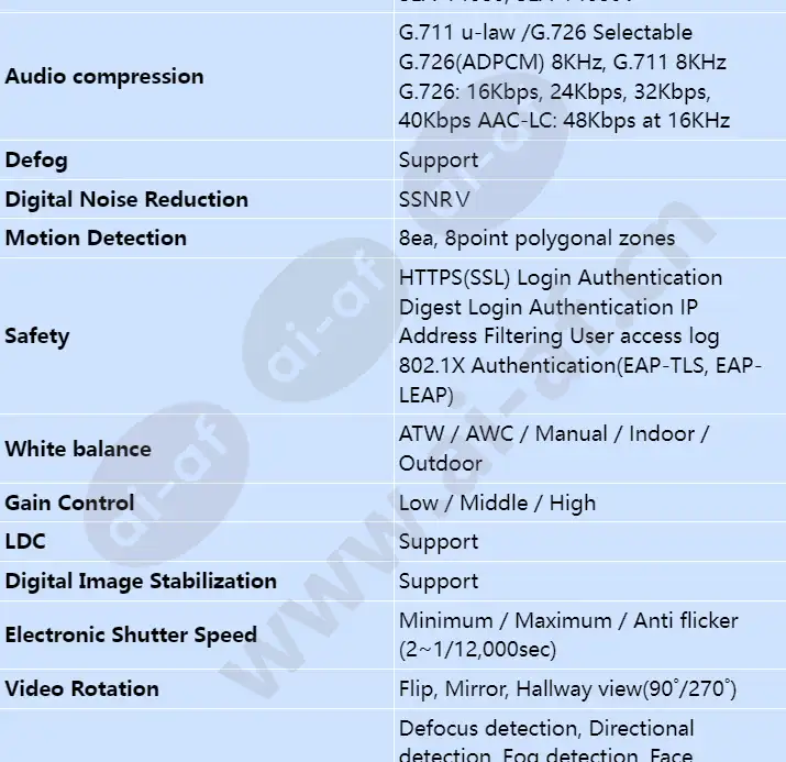 • Max. 2Megapixel (1920 x 1080) resolution • H.265, H.264, MJPEG codec support, Multiple streaming • Max. 60fps@2MP (H.265 / H.264) • WDR (120dB), Defog, DIS, WiseStreamII • Tampering, Loitering, Directional detection, Fog detection • Audio detection, Digital auto tracking, Heatmap • Queue management, Face detection, People counting • Motion detection, Handover • Memory slot (Max. 256GB), Hallway View • LDC, PoE / 12V DC, Bi-directional audio support Resolution 1920x1080, 1280x1024, 1280x960, 1280x720, 1024x768, 800x600, 800x448, 720x576, 720x480, 640x480, 640x360, 320x240 Max. Framerate H.265/H.264: Max. 60fps/50fps(60Hz/50Hz) MJPEG: Max. 30fps/25fps(60Hz/50Hz) Video Out CVBS: 1.0 Vp-p / 75Ω composite, 720x480(N), 720x576(P) for installation USB: Micro USB Type B, 1280x720 for