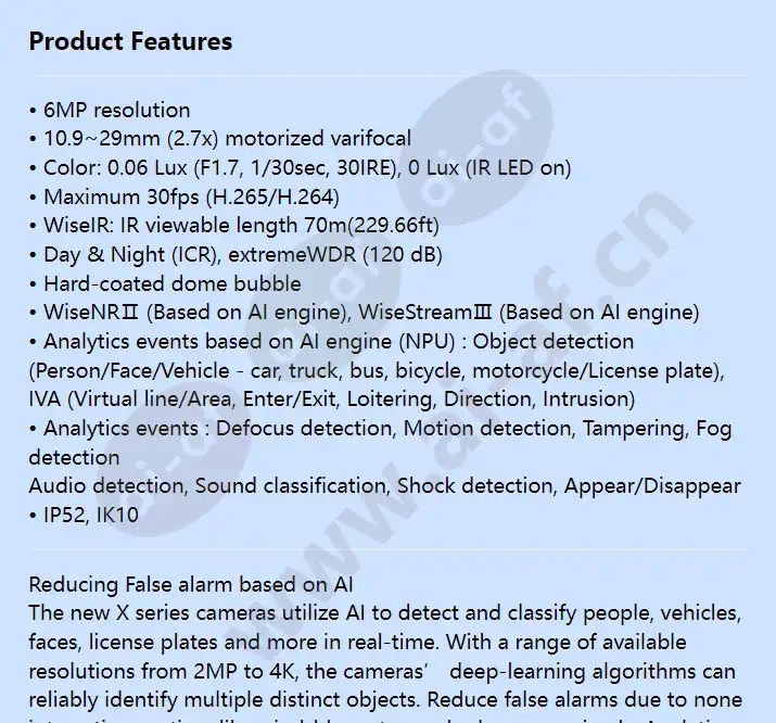 • 6MP resolution • 10.9~29mm (2.7x) motorized varifocal • Color: 0.06 Lux (F1.7, 1/30sec, 30IRE), 0 Lux (IR LED on) • Maximum 30fps (H.265/H.264) • WiseIR: IR viewable length 70m(229.66ft) • Day & Night (ICR), extremeWDR (120 dB) • Hard-coated dome bubble • WiseNRⅡ (Based on AI engine), WiseStreamⅢ (Based on AI engine) • Analytics events based on AI engine (NPU) : Object detection (Person/Face/Vehicle - car, truck, bus, bicycle, motorcycle/License plate), IVA (Virtual line/Area, Enter/Exit, Loitering, Direction, Intrusion) • Analytics events : Defocus detection, Motion detection, Tampering, Fog detection Audio detection, Sound classification, Shock detection, Appear/Disappear • IP52, IK10 Reducing False alarm based on AI The new X series cameras utilize AI to detect and classify people