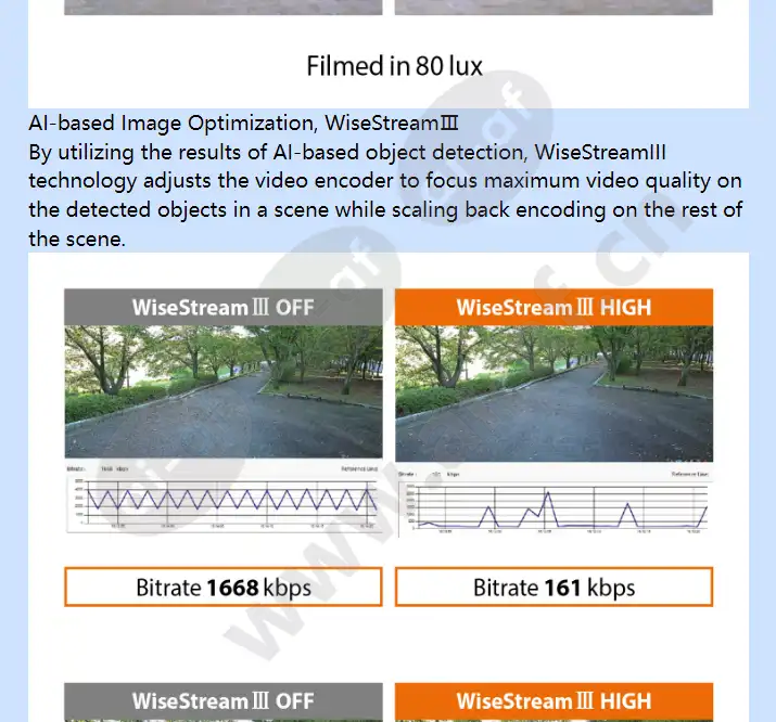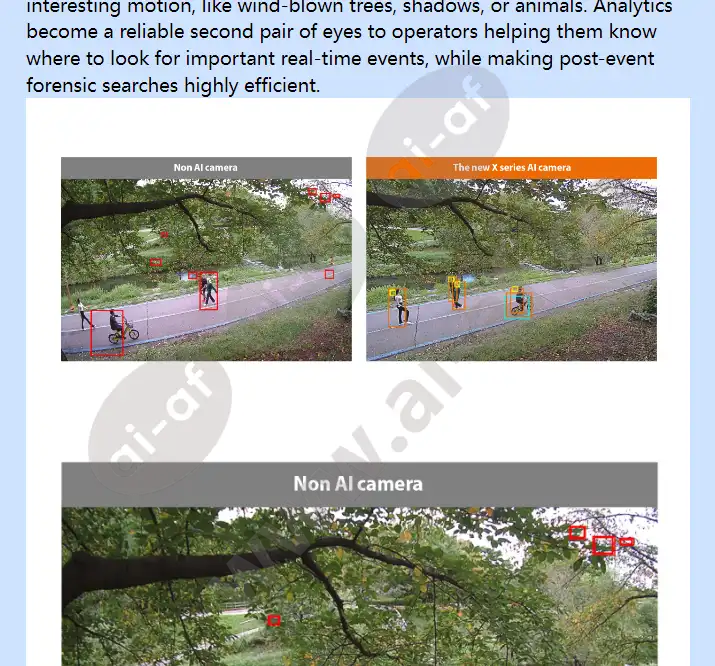 • 6MP resolution • 4.4~9.3mm (2.1x) motorized varifocal • Color: 0.04Lux (F1.3, 1/30sec, 30IRE), 0Lux (IR LED on) • Maximum 30fps@6MP (H.265/H.264) • WiseIR: IR viewable length 40m (131.23ft) • Day & Night (ICR), extremeWDR (120dB), WiseNRⅡ (Using AI engine) • H.265, H.264, MJPEG, WiseStreamⅡ, WiseStreamⅢ (Using AI engine) • DIS with built-in Gyro sensor • Analytics events based on AI engine (NPU) : Object detection (Person/Face/Vehicle - car, truck, bus, bicycle, motorcycle/License plate), IVA (Virtual line/Area, Enter/Exit, Loitering, Direction, Intrusion) • Analytics events : Defocus detection, Motion detection, Tampering, Fog detection Audio detection, Sound classification, Shock detection, Appear/Disappear • IP66, IP67, NEMA4X, IK10 Reducing False alarm based on AI The new X series