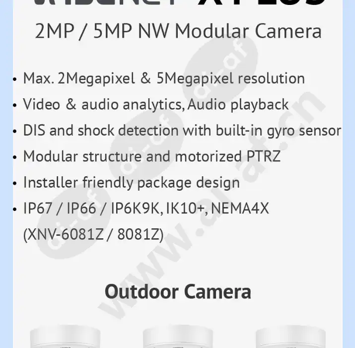 • Max. 2Megapixel resolution • 0.015Lux@F1.4 (Color), 0.0015Lux@F1.4 (B/W) • Day & Night (ICR), WDR (150dB) • Hallway View, WiseStreamII Support • Video & audio analytics, Audio playback • DIS and shock detection with built-in gyro sensor • Modular structure, PoE, 12VDC, 24VAC (Optional) • IP66/IP67, IK10+, NEMA4X 2MP / 5MP NW Modular Camera Faster installation, reduced costs Advanced performance, multiplied values 2MP / 5MP NW Modular Camera Max. 2Megapixel & 5Megapixel resolution Video & audio analytics, Audio playback DIS and shock detection with built-in gyro sensor Modular structure and motorized PTRZ Installer friendly package design IP67/IP66/IP6K9K, IK10+, NEMA4X(XNV-6081Z/8081Z) The most powerful chipset WISENET 5 Wisenet X series is supercharged by the most powerful chipset ever