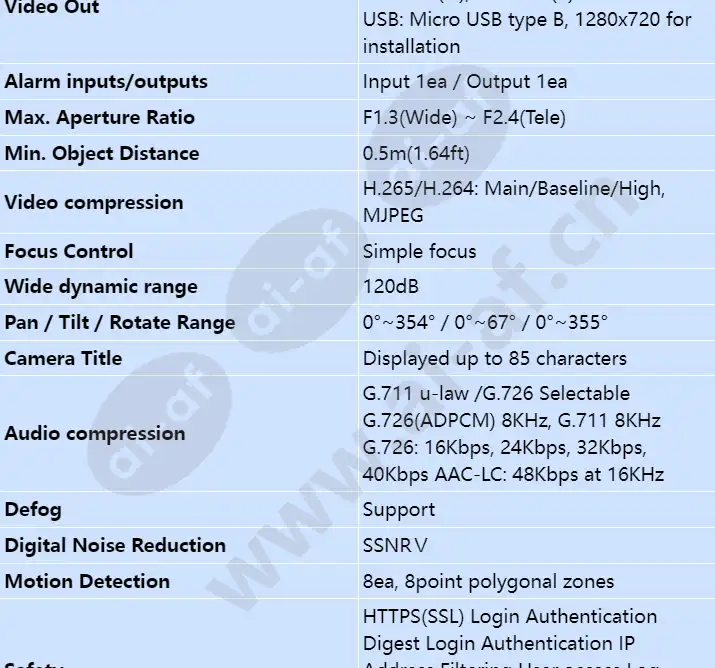 • Max. 5Megapixel (2560 x 1920) resolution • 3.9 ~ 9.4mm (2.4x) motorized varifocal lens • Max. 30fps@all resolutions (H.265 / H.264) • H.265, H.264, MJPEG codec supported, Multiple streaming • Day & Night (ICR), WDR (120dB), Defog • Loitering, Directional detection, Tampering, Audio detection, Digital auto tracking, Fog detection, Sound classification • Motion detection, Handover • SD/SDHC/SDXC memory 2slots (Max. 512GB) • Hallway view, WiseStream II support • IR viewable length 50m, IP66, NEMA 4X, IK10+ • LDC, PoE, Bi-directional audio support Imaging Device 1/1.8" 6MP CMOS Resolution 2560x1920, 2560x1440, 1920x1080, 1600x1200, 1280x1024, 1280x960, 1280x720, 1024x768, 800x600, 800x448, 720x576, 720x480, 640x480, 640x360, 320x240 Max. Framerate H.265/H.264: Max. 30fps/25fps(60Hz/50Hz)