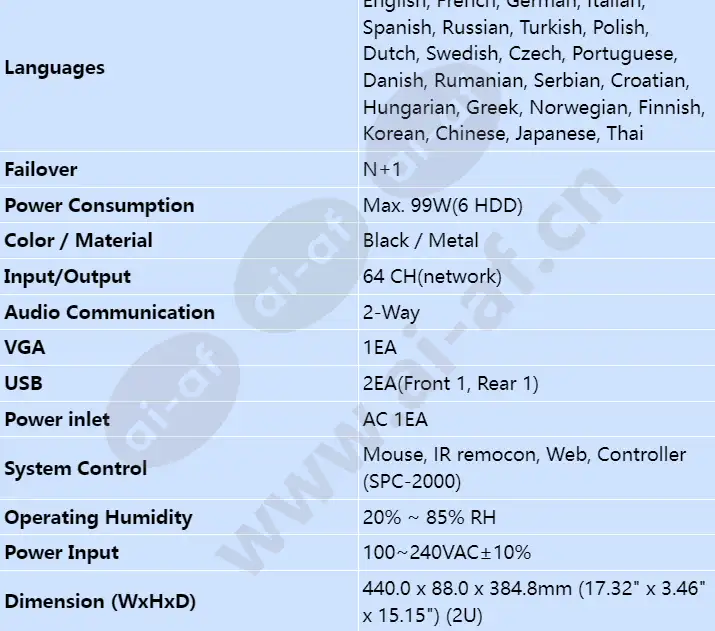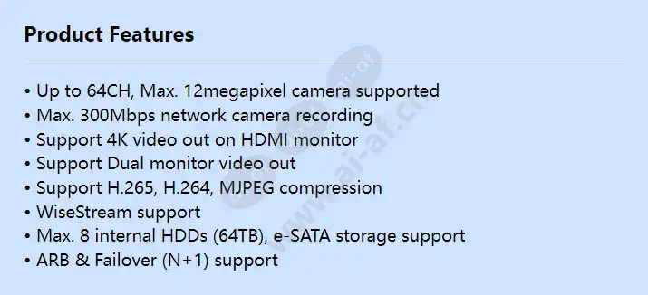• Up to 64CH, Max. 12megapixel camera supported • Max. 300Mbps network camera recording • Support 4K video out on HDMI monitor • Support Dual monitor video out • Support H.265, H.264, MJPEG compression • WiseStream support • Max. 8 internal HDDs (64TB), e-SATA storage support • ARB & Failover (N+1) support Inputs Max. 64CH Resolution 12MP ~ CIF Protocols Wisenet, ONVIF Local Display [Dual Display Compression H.265, H.264, MJPEG Recording Bandwidth Max. 300Mbps Mode Normal, Schedule(Continuous/Event), Event (Pre/Post) Event Trigger Alarm Input, Video Loss, Camera Event(Alarm, MD, Video Analytics, Defocus) Event Action e-Mail, PTZ Preset, Alarm Out, Buzzer, Monitor Out Playback Bandwidth Max. 32Mbps(16CH simultaneously) User Max. 4 Users (Local 1, Remote 3) Simultaneous playback Max.
