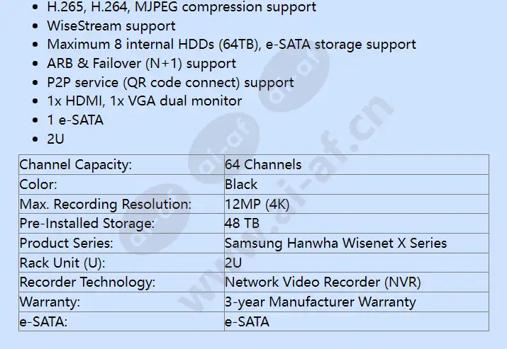 Samsung Hanwha XRN-3010A-48TB 64 Channel Network Video Recorder with 48TB HDD Hanwha’s XRN-3010 is a 64 channel network video recorder that will allow the connection of up to 64 cameras with up to 12 MP resolution each, triple codec recording and playback H.265/H.264/MJPEG, dual monitor output, 4K HDMI output, 8 hot swap hard disc drives. It also supports ARB & failover (N+1), e-SATA external storage, and WiseStream compression technology. Includes QR code for easy mobile app access. Key Features: Up to 64 Channel, Maximum 12-megapixel camera supported 48TB HDD included Maximum 300Mbps network camera recording 4K video out on HDMI monitor support Dual monitor video out support H.265, H.264, MJPEG compression support WiseStream support Maximum 8 internal HDDs (64TB), e-SATA storage support