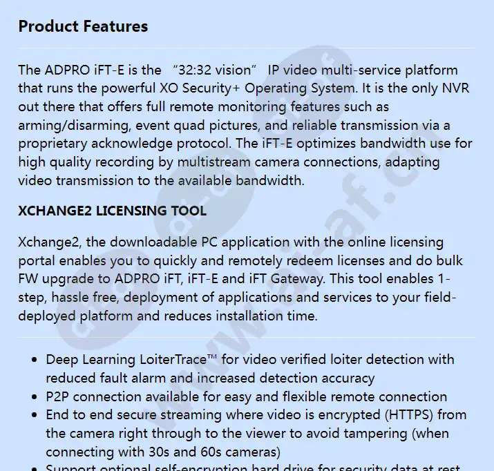 The ADPRO iFT-E is the “32:32 vision” IP video multi-service platform that runs the powerful XO Security+ Operating System. It is the only NVR out there that offers full remote monitoring features such as arming/disarming, event quad pictures, and reliable transmission via a proprietary acknowledge protocol. The iFT-E optimizes bandwidth use for high quality recording by multistream camera connections, adapting video transmission to the available bandwidth. XCHANGE2 LICENSING TOOL Xchange2, the downloadable PC application with the online licensing portal enables you to quickly and remotely redeem licenses and do bulk FW upgrade to ADPRO iFT, iFT-E and iFT Gateway. This tool enables 1-step, hassle free, deployment of applications and services to your field-deployed platform and reduces