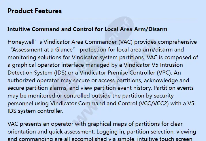 Intuitive Command and Control for Local Area Arm/Disarm Honeywell’s Vindicator Area Commander (VAC) provides comprehensive “Assessment at a Glance” protection for local area arm/disarm and monitoring solutions for Vindicator system partitions. VAC is composed of a graphical operator interface managed by a Vindicator V5 Intrusion Detection System (IDS) or a Vindicator Premise Controller (VPC). An authorized operator may secure or access partitions, acknowledge and secure partition alarms, and view partition event history. Partition events may be monitored or controlled outside the partition by security personnel using Vindicator Command and Control (VCC/VCC2) with a V5 IDS system controller. VAC presents an operator with graphical maps of partitions for clear orientation and quick