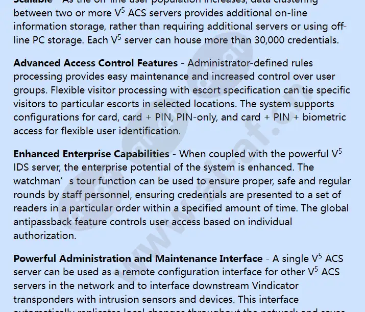 Autonomous Access Controller and Credential Database Server Built on the V 5 Network Security Appliance™, the Vindicator® ACS solution is a self-contained access control system that does not require a PC or Windows software to operate. The V 5 ACS solution consists of any number of V 5 ACS servers, readers, and door hardware and other I/O. Each V 5 ACS server houses the necessary credential database to administer complex access routines for predefined regions of a facility by interfacing with its associated credential readers and access control hardware. Enterprise Clustering and Peer-to-Peer Capability Each V 5 ACS server can act as a database server to other V 5 ACS servers for centralized access control management using database replication and management technology. This increases