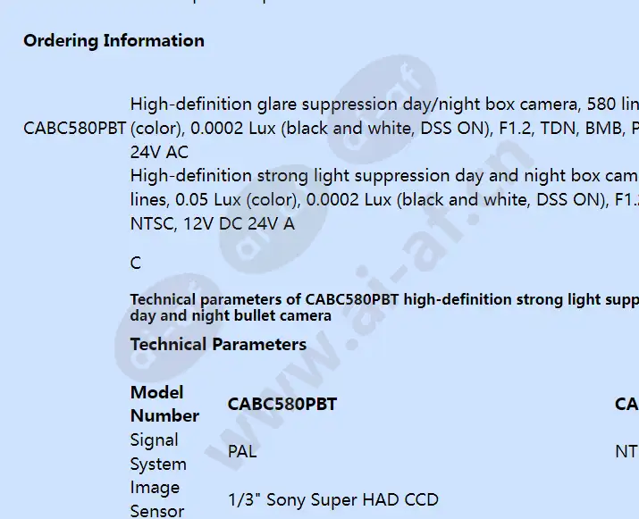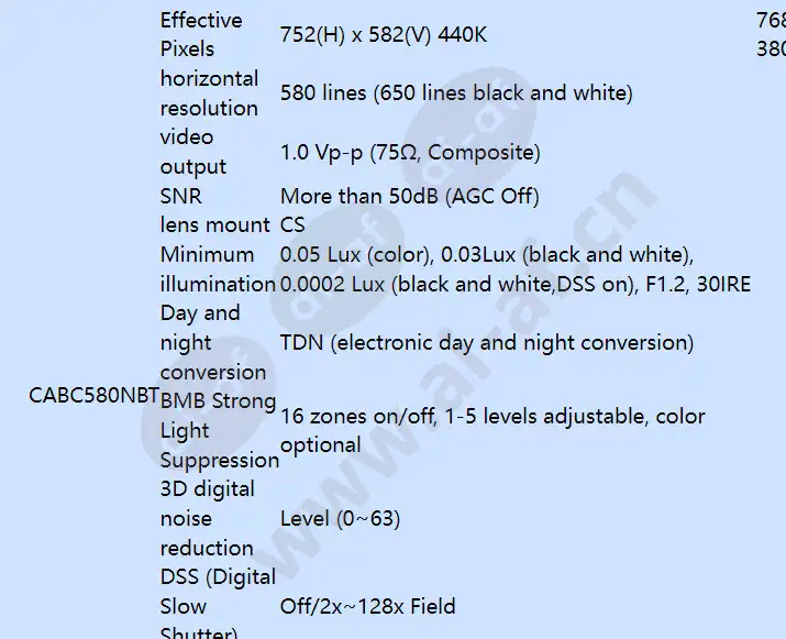 Features and advantages of CABC580PBT high-definition glare suppression day and night bullet camera Performance Features and Ordering Information Performance characteristics • 1/3" SONY Super HAD CCD • High definition: 580 lines (color) 650 lines (black and white) • BMB strong light suppression function • TDN (Ture Day Night dual filter switching), • Minimum illumination: 0.05 Lux (color), 0.0002 Lux (monochrome,DSS ON), F1.2 • OSD menu, Auto white balance • Digital noise reduction function, digital amplification function • AGC, BLC, Anti-flicker • Motion detection, privacy zone, mirror function • 12VDC 24VAC dual power input Ordering Information CABC580PBT High-definition glare suppression day/night box camera, 580 lines, 0.05 Lux (color), 0.0002 Lux (black and white, DSS ON), F1.2, TDN