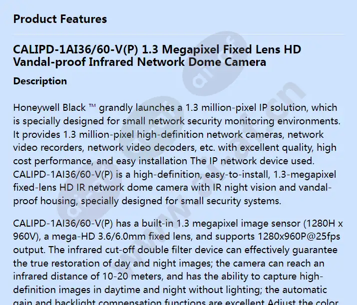 CALIPD-1AI36/60-V(P) 1.3 Megapixel Fixed Lens HD Vandal-proof Infrared Network Dome Camera Description Honeywell Black ™ grandly launches a 1.3 million-pixel IP solution, which is specially designed for small network security monitoring environments. It provides 1.3 million-pixel high-definition network cameras, network video recorders, network video decoders, etc. with excellent quality, high cost performance, and easy installation The IP network device used. CALIPD-1AI36/60-V(P) is a high-definition, easy-to-install, 1.3-megapixel fixed-lens HD IR network dome camera with IR night vision and vandal-proof housing, specially designed for small security systems. CALIPD-1AI36/60-V(P) has a built-in 1.3 megapixel image sensor (1280H x 960V), a mega-HD 3.6/6.0mm fixed lens, and supports