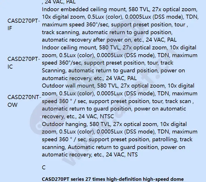 CASD270PT series 27 times high-definition high-speed dome camera and advantages Performance Features and Ordering Information Performance characteristics • 270x zoom (27x optical zoom/10x digital zoom) • High resolution 580TVL (color), 600TVL (black and white) • Up to 360˚/ sec high speed operation • TDN (True Day Night), dual filter automatic switching • Digital Slow Shutter (DSS), improve night light sensitivity • Auto focus, auto flip, angle direction display function • Automatic return to guard position function, automatic power-on recovery function, privacy zone function • Auto zoom lock speed, speed is linked with zoom range • Various installation methods indoor and outdoor • Lightning and surge protection Ordering Information CASD270PT-OW Outdoor wall mount, 580 TVL, 27x optical