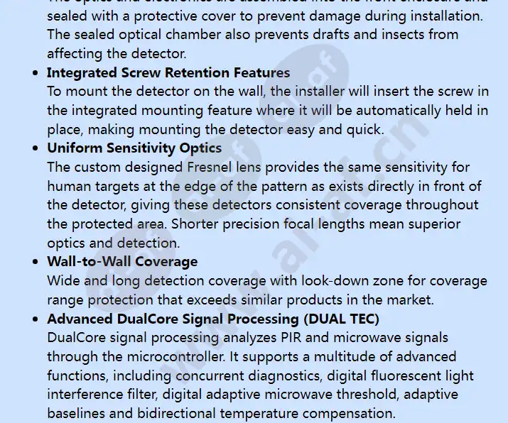Designed with the installer in mind, these high performance small form factor motion detectors offer a trouble-free, out of the box experience to simplify the install process and reduce install time. With the passive infrared IS3035 and IS3050 and DUAL TEC DT8035 and DT8050, optimum performance is achieved using custom developed extended range Fresnel optics, look down, cover and wall tamper, and selectable pet immunity. Leading edge sensing technologies and a wide range of models to suit the requirements of most applications, Honeywell’s family of IS3000 and DT8000 motion detectors will maximize intruder detection while diminishing false alarms. Sleek, Sturdy Housing The sleek, sturdy housing blends with any residential or commercial interior and is constructed of ABS plastic for