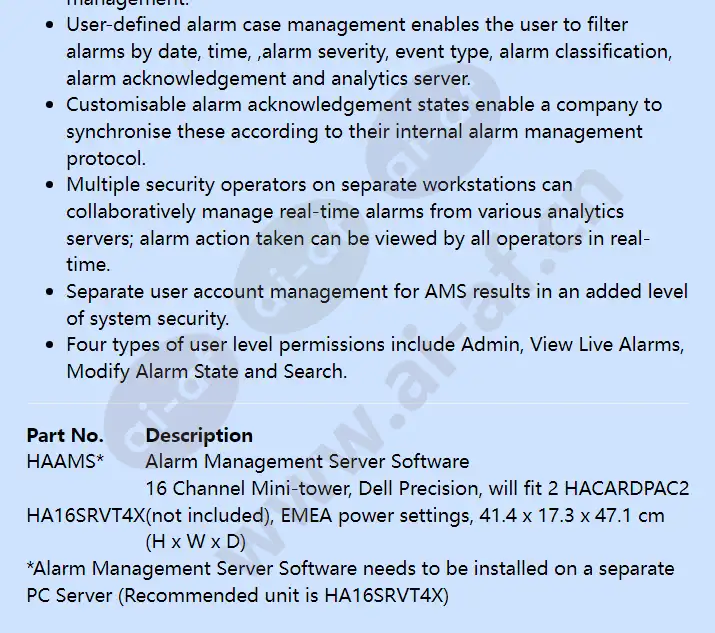 Honeywell’s Alarm Management suite allows security operators to monitor real-time alarms from a large number of video analytics servers. The Alarm Management Server (AMS) is a service that connects to a large number of Honeywell video analytics servers to receive analytics alarms generated by these servers. Multiple security operators on separate workstations can run separate copies of Alarm Watch Station (AWS) client applications to connect to AMS and collaboratively manage real-time alarms coming from all various analytics servers. The alarm acknowledgement state modified by one operator can be seen on the AWS by all other operators in real-time. There are three components in the software that enable Alarm Management functionality: Alarm Management Server – Running as a Windows service