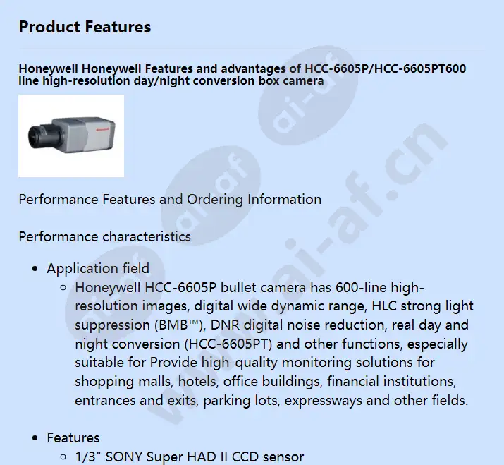 Honeywell Honeywell Features and advantages of HCC-6605P/HCC-6605PT600 line high-resolution day/night conversion box camera Performance Features and Ordering Information Performance characteristics Application field Honeywell HCC-6605P bullet camera has 600-line high-resolution images, digital wide dynamic range, HLC strong light suppression (BMB™), DNR digital noise reduction, real day and night conversion (HCC-6605PT) and other functions, especially suitable for Provide high-quality monitoring solutions for shopping malls, hotels, office buildings, financial institutions, entrances and exits, parking lots, expressways and other fields. Features 1/3" SONY Super HAD II CCD sensor Horizontal resolution: 600 lines Honeywell HLC Bright Light Suppression (BMB™) Technology Automatic day and