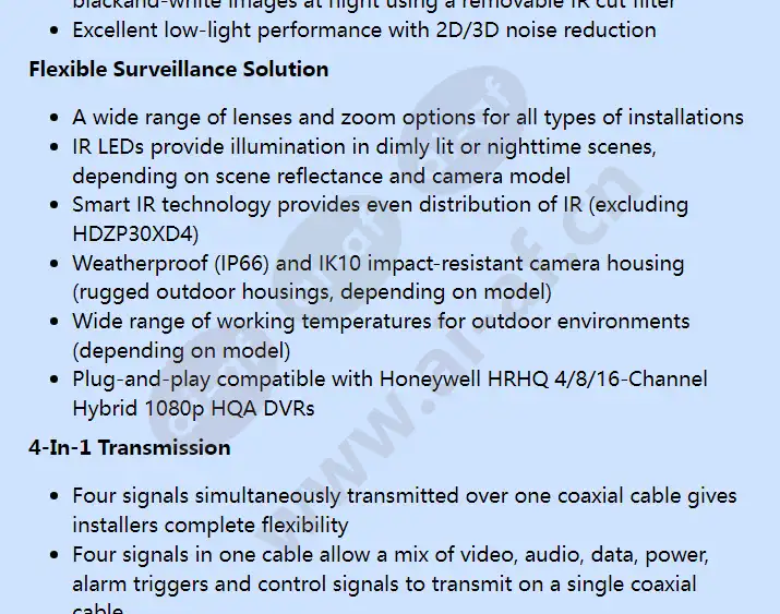 2MP HQA TDN WDR IR MFZ Rugged Dome Supercharge your analog security system with Honeywell’s HQA technology for high definition 1080p images over your existing coax infrastructure. The Performance Series 1080p HQA cameras includes a wide range of high performing IR cameras that are easy to install and even easier to use. Superior Image Quality Full HD fixed cameras with up to 1080p 25/30 fps images with either a 1/2.8" 2.1 MP sensor or 1/2.9" 2.0 MP sensor Superior HD PTZ camera (HDZP30XD4) with up to 4 MP 25/30 fps images with a 1/3" 4.0 MP sensor Long distance transmission over coaxial cable with low attenuation and latency Either True WDR (120 dB) or Digital WDR (DWDR) ensures glare-free images True Day/Night provides vivid color images by day and clear blackand-white images at night