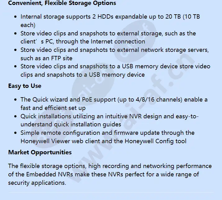 Performance Series 4K/8MP embedded NVRs Introducing Honeywell’s Performance Series Embedded NVRs, our newest affordable, fully-featured NVRs offer Ultra 4k HD video resolution. Choose between a 4-, 8-, or 16-channel NVR, with multiple hard drive options and up to 20 TB of internal storage, for an ideal and flexible solution to fit your surveillance needs. Fully-featured NVRs High decoding capability for Ultra 4K HD viewing and recording View 4/8/16 channels simultaneously with synchronized realtime playback on your monitor (depending on your model) Up to 8 MP (4K) resolution live view, preview and playback Up to 8 channels at 1080p H.265/H.264 decoding Dynamic, Accessible Monitoring Mobile apps provide anytime, anywhere access for both Apple® and Android™ devices (smartphones, tablet