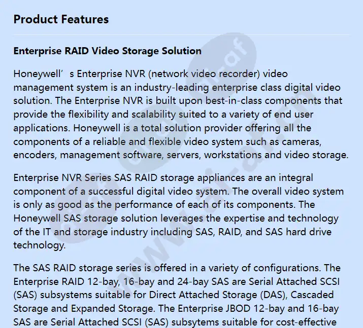 Enterprise RAID Video Storage Solution Honeywell’s Enterprise NVR (network video recorder) video management system is an industry-leading enterprise class digital video solution. The Enterprise NVR is built upon best-in-class components that provide the flexibility and scalability suited to a variety of end user applications. Honeywell is a total solution provider offering all the components of a reliable and flexible video system such as cameras, encoders, management software, servers, workstations and video storage. Enterprise NVR Series SAS RAID storage appliances are an integral component of a successful digital video system. The overall video system is only as good as the performance of each of its components. The Honeywell SAS storage solution leverages the expertise and technology