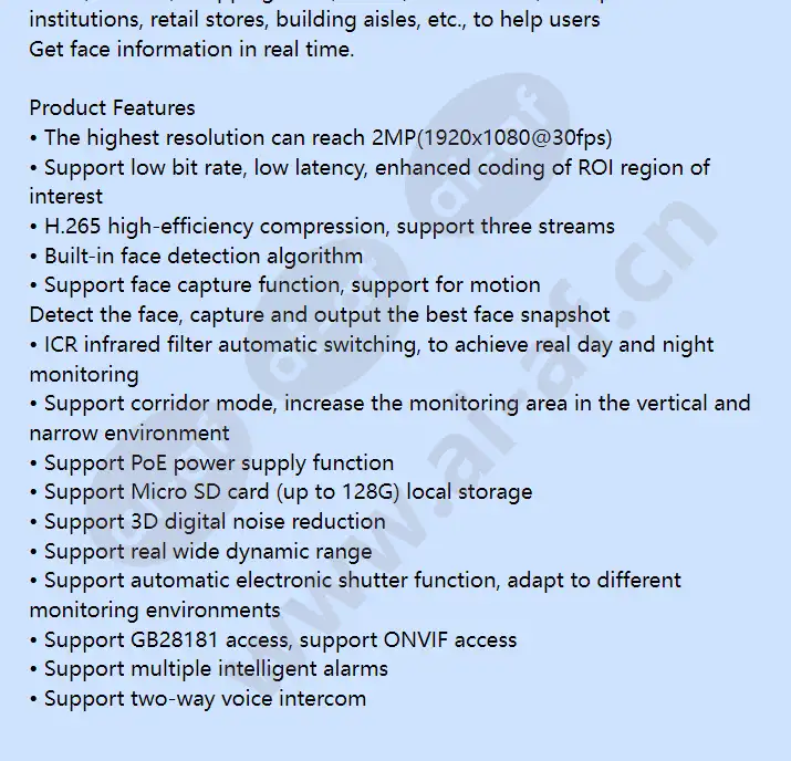 HICC-F2600T-FC Honeywell 1080P HD face capture camera Honeywell HICC-2600T-FC HD Face Capture Gun IP Camera, Combining advanced imaging and camera technology with innovative IP network technology, built-in accurate face detection and capture algorithm, continuously extracting human facial features from video images, outputting the best face results, providing users with accurate and efficient The application of the face capture function. HICC-2600T-FC high-definition face capture network bullet camera has become an ideal solution in the field of advanced surveillance. HICC-2600T-FC can detect 10 face targets in the screen at the same time. Faces larger than 80 pixels can be accurately captured in the screen. Ordinary glasses, short bangs, and short hat brims will not affect the capture.