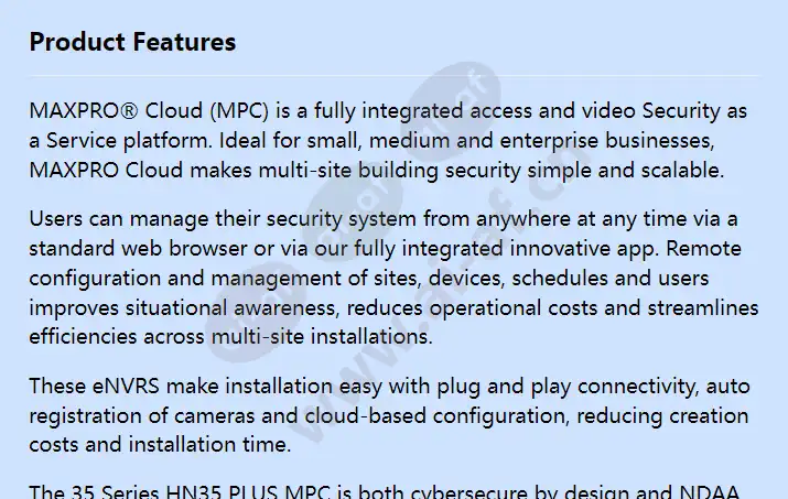 MAXPRO® Cloud (MPC) is a fully integrated access and video Security as a Service platform. Ideal for small, medium and enterprise businesses, MAXPRO Cloud makes multi-site building security simple and scalable. Users can manage their security system from anywhere at any time via a standard web browser or via our fully integrated innovative app. Remote configuration and management of sites, devices, schedules and users improves situational awareness, reduces operational costs and streamlines efficiencies across multi-site installations. These eNVRS make installation easy with plug and play connectivity, auto registration of cameras and cloud-based configuration, reducing creation costs and installation time. The 35 Series HN35 PLUS MPC is both cybersecure by design and NDAA compliant and