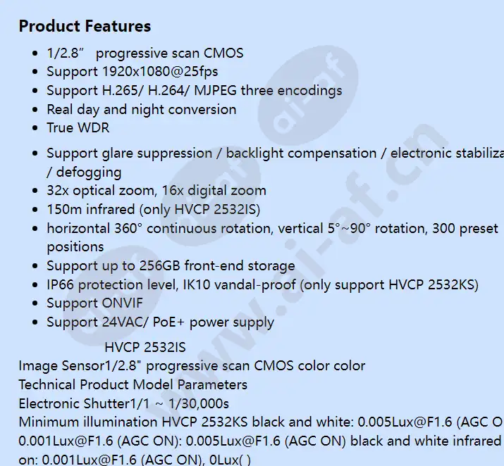 HVCP-2532KS/ 2532IS 2MP 32x Speed Dome IP Camera Honeywell HVCP-2532KS 32x high-definition speed dome network camera and HVCP-2532IS infrared high-definition speed dome network camera combine world-class imaging and camera technology with innovative IP network technology, providing users with 1080P super High image quality with excellent, accurate color reproduction makes it an ideal solution for advanced surveillance. HVCP 2532KS and HVCP 2532IS support 360° infinite rotation and are equipped with a 32X auto-focus optical zoom lens, allowing users to view the surveillance area flexibly and clearly. The functions of real day-night conversion and real wide dynamic range can be applied to monitoring environments with large differences in light and shade around the clock. Built-in