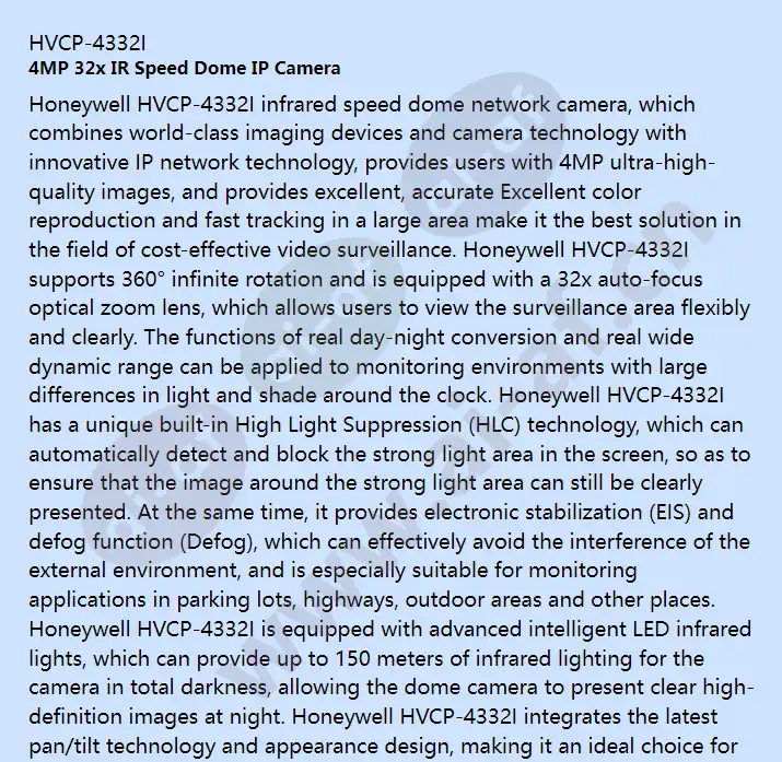 HVCP-4332I 4MP 32x IR Speed Dome IP Camera Honeywell HVCP-4332I infrared speed dome network camera, which combines world-class imaging devices and camera technology with innovative IP network technology, provides users with 4MP ultra-high-quality images, and provides excellent, accurate Excellent color reproduction and fast tracking in a large area make it the best solution in the field of cost-effective video surveillance. Honeywell HVCP-4332I supports 360° infinite rotation and is equipped with a 32x auto-focus optical zoom lens, which allows users to view the surveillance area flexibly and clearly. The functions of real day-night conversion and real wide dynamic range can be applied to monitoring environments with large differences in light and shade around the clock. Honeywell