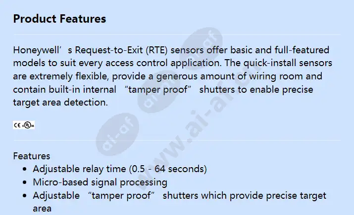 Honeywell’s Request-to-Exit (RTE) sensors offer basic and full-featured models to suit every access control application. The quick-install sensors are extremely flexible, provide a generous amount of wiring room and contain built-in internal “tamper proof” shutters to enable precise target area detection. Features Adjustable relay time (0.5 - 64 seconds) Micro-based signal processing Adjustable “tamper proof” shutters which provide precise target area Two Form C outputs Swivel optics - allow for offset mounting Patented black bug guard Available in white or black Piezo Sounder with volume control Door contact input Reader/keypad/keyswitch input Remote arming and sounder inputs Cover tamper Part No. Description IS310WH (0-000-361-01) Entry Level RTE - White IS310BL (0-000-361-02) Entry
