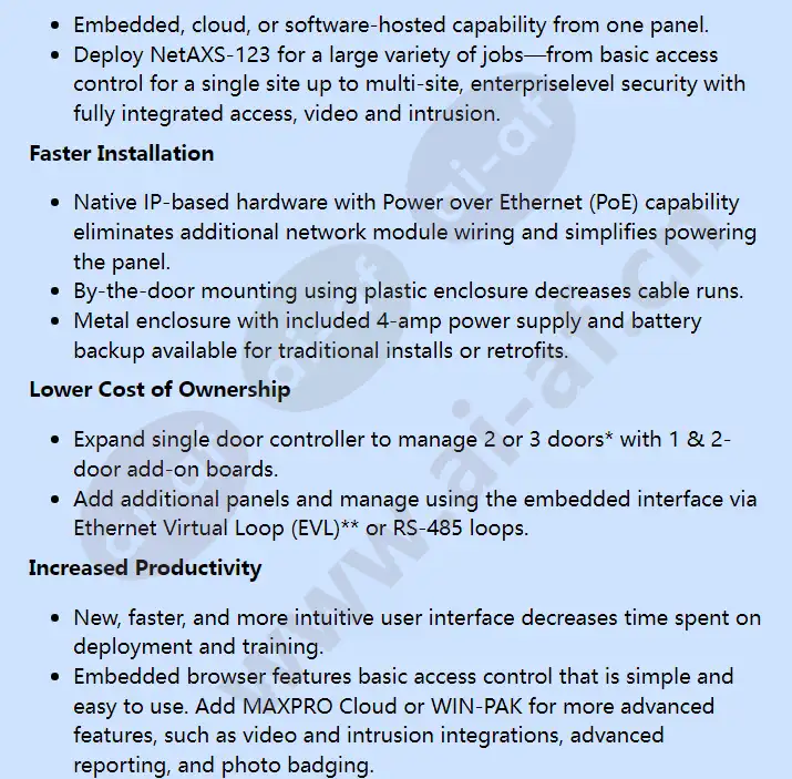 Hybrid Access Control Panel Honeywell’s web-based NetAXS controller provides solutions for installations of any size. NetAXS-123 enables users to securely manage their system anywhere there's an Internet connection—with no dedicated PC or software costs. The user-friendly design makes it simple to install and easy to operate and maintain. NetAXS-123 gives you all the benefits of traditional access control, such as helping you secure doors, manage employee access, and manage sites remotely. It also lets you pull reports easily to meet compliance requirements. With a browser-based interface, your learning curve and training times are significantly decreased. No dedicated software is required—simply log on and you're ready to go, securely—from the office or anywhere. You can manage