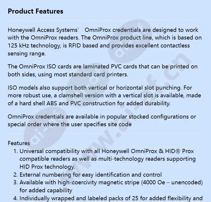 Honeywell Access Systems’ OmniProx credentials are designed to work with the OmniProx readers. The OmniProx product line, which is based on 125 kHz technology, is RFID based and provides excellent contactless sensing range. The OmniProx ISO cards are laminated PVC cards that can be printed on both sides, using most standard card printers. ISO models also support both vertical or horizontal slot punching. For more robust use, a clamshell version with a vertical slot is available, made of a hard shell ABS and PVC construction for added durability. OmniProx credentials are available in popular stocked configurations or special order where the user specifies site code Features Universal compatibility with all Honeywell OmniProx & HID® Prox compatible readers as well as multi-technology
