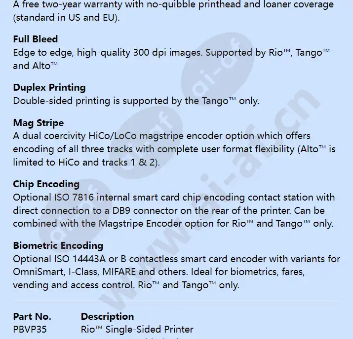 Professional ID Card Printers Rio™ Card Printer (PBVP35) Built tough to withstand the hard work of high throughput jobs, but also ideal for low duty-cycle applications. Downloads and prints a single-sided full color card image (YMCKO) in less than 20 seconds using advanced bidirectional USB or parallel port. Tango™ Double-Sided Card Printer (PBVP35DO) The leading printer for high volume printing applications. The Tango™ downloads and prints a double-sided, full color image in 40 seconds using advanced bi-directional USB or parallel port. Prints double-sided YMCKOK in around 30 seconds. Alto™ Card Printer (PBVP43) The smallest and lightest in its class. This secure, entry-level, handfed printer downloads and prints a full color, edge-to-edge image in 30 seconds and features a HoloKote®