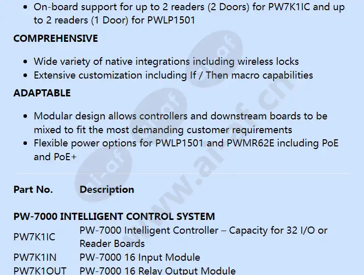 The PW7000-Series Access Control System is an advanced access control hardware architecture capable of providing solutions for large enterprise applications. The Intelligent Controllers provide power and flexibility with an embedded Linux OS, improved processor and increased memory as well as onboard crypto chip which adds an additional layer of security to sensitive data. The PW-series controllers support a combination of I/O and reader boards to monitor alarm input points, relay output points and interface with access control readers. By offering a modular design, the system can be tailored to meet a wide range of applications while optimizing cost and installation. The PW7K1IC comes with 2 on-board reader ports that support multiple reader communication protocols including Wiegand and