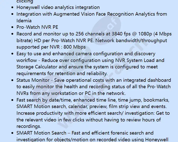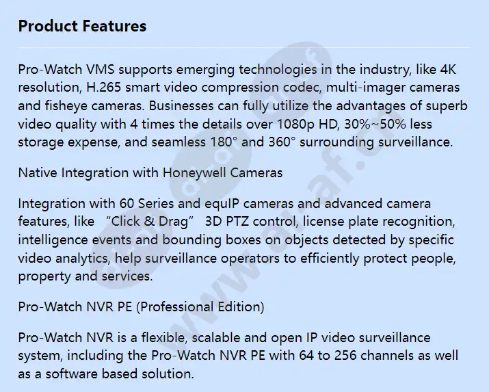 Pro-Watch VMS supports emerging technologies in the industry, like 4K resolution, H.265 smart video compression codec, multi-imager cameras and fisheye cameras. Businesses can fully utilize the advantages of superb video quality with 4 times the details over 1080p HD, 30%~50% less storage expense, and seamless 180° and 360° surrounding surveillance. Native Integration with Honeywell Cameras Integration with 60 Series and equIP cameras and advanced camera features, like “Click & Drag” 3D PTZ control, license plate recognition, intelligence events and bounding boxes on objects detected by specific video analytics, help surveillance operators to efficiently protect people, property and services. Pro-Watch NVR PE (Professional Edition) Pro-Watch NVR is a flexible, scalable and open IP video