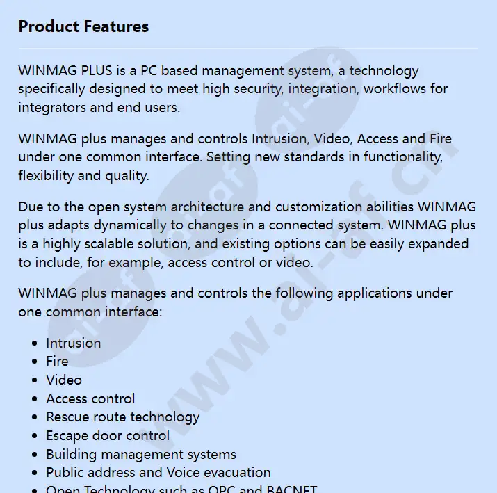 WINMAG PLUS is a PC based management system, a technology specifically designed to meet high security, integration, workflows for integrators and end users. WINMAG plus manages and controls Intrusion, Video, Access and Fire under one common interface. Setting new standards in functionality, flexibility and quality. Due to the open system architecture and customization abilities WINMAG plus adapts dynamically to changes in a connected system. WINMAG plus is a highly scalable solution, and existing options can be easily expanded to include, for example, access control or video. WINMAG plus manages and controls the following applications under one common interface: Intrusion Fire Video Access control Rescue route technology Escape door control Building management systems Public address and