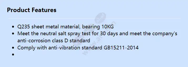 Q235 sheet metal material, bearing 10KG Meet the neutral salt spray test for 30 days and meet the company's anti-corrosion class D standard Comply with anti-vibration standard GB15211-2014 Anti-corrosion level Class C/D Net weight 0.98KG Gross weight 1.04KG Product dimensions 40x113x160mm Packing dimensions 190x125x185mm Application scenario Applicable to indoor/outdoor pole/beam-mounted ITS cameras, large bullet cameras, medium-sized bullet cameras, box cameras, small bullet cameras, and housings Anti-vibration standard Compliance with GB 15211-2014 Material Q235C sheet metal, self-clinching nuts, and passivation for stainless-steel hose clamps Load bearing 10KG Installation mode Pole- or beam-mount Hoop diameter 60-150 mm