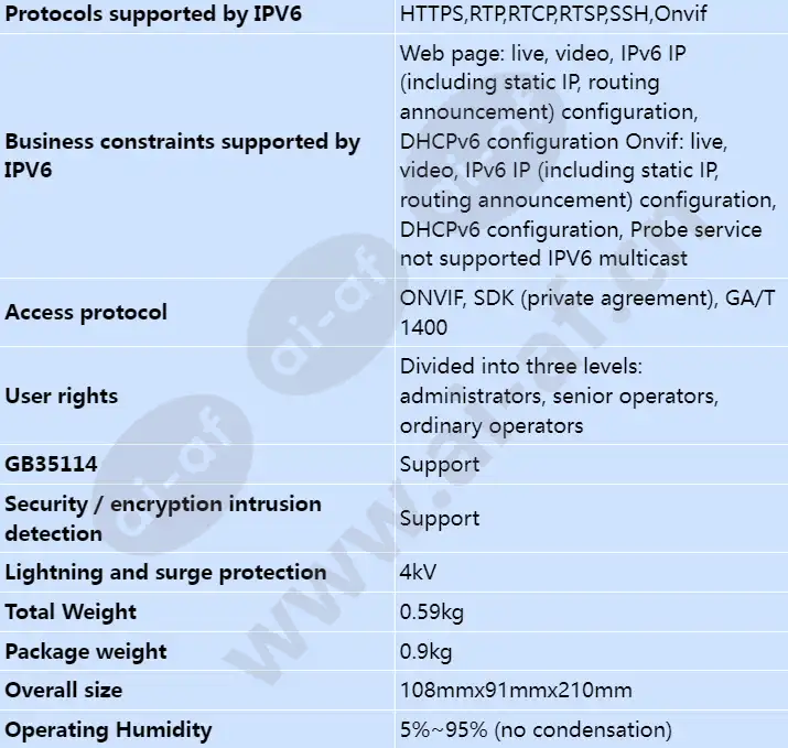 Support heat map; Adopt 1/2.7" CMOS; 120dB super wide dynamic, strong contrast scene to restore true details; Chip Hi3516AV100 RAM DDR3 0.2500 GB Flash SPI NAND FLASH 128.0 MB Sensor maximum image size 2MP 1920(H)*1080(V) Sensor photosensitive surface size 1/2.7" Minimum illumination Color: 0.005Lux (F1.2, AGC ON, 1/30 shutter), black and white: 0.0005Lux (F1.2, AGC ON, 1/30 shutter), 0Lux (open infrared) Lens focal length 2.7-12mm Camera angle W: 105 (H) x 72 (V); T: 28 (H) x 20 (V) (focus adjustment may be required for the W end) Infrared light fill distance 30m Video Encoding Format MJPEG/H.264/H.265 Heat map Support Ethernet interface Support Number of Ethernet interfaces 1 Ethernet interface bandwidth 1 RJ45 10M / 100M adaptive Ethernet port Power type DC12V,PoE(IEEE 802.3af) Power