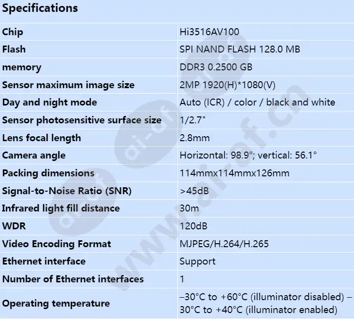 Adopt 1/2.7" CMOS; 120dB super wide dynamic, strong contrast scene to restore true details; Chip Hi3516AV100 RAM DDR3 0.2500 GB Flash SPI NAND FLASH 128.0 MB Sensor maximum image size 2MP 1920(H)*1080(V) Sensor photosensitive surface size 1/2.7" Minimum illumination Color: 0.005Lux (F1.2, AGC ON, 1/30 shutter), black and white: 0.0005Lux (F1.2, AGC ON, 1/30 shutter), 0Lux (open infrared) Lens focal length 2.8mm Camera angle Horizontal: 98.9°; vertical: 56.1° Infrared light fill distance 30m Video Encoding Format MJPEG/H.264/H.265 Ethernet interface Support Number of Ethernet interfaces 1 Ethernet interface bandwidth 1 RJ45 10M / 100M adaptive Ethernet port Power type DC12V,PoE(IEEE 802.3af) Power consumption Maximum: 7 W; typical: 2.2 W Operating temperature –30°C to +60°C (illuminator