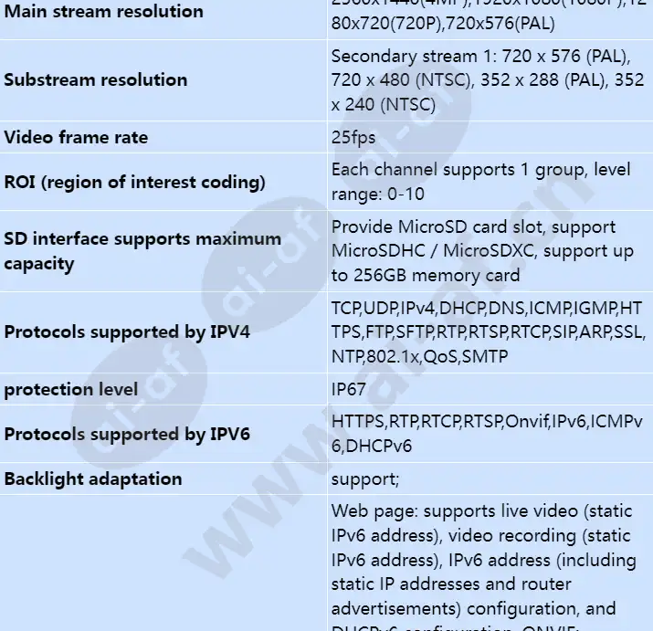 Support 1 TOPS computing power; Support backlight adaptation; Adopt 1/2.7" CMOS; 120dB super wide dynamic, strong contrast scene to restore true details; Support dual light fill light, voice intercom function; Deep learning elevator battery car detection algorithm; Support POE power supply; Behavior Analysis Video Mode Elevator battery car inspection Computing power 1 TOPS Resolution 4MP 2560(H)*1440(V) Sensor photosensitive surface size 1/2.7" CMOS Minimum illumination Color: 0.005 lux (F1.2, AGC ON, 1/30s shutter speed); B/W: 0.0025 lux (F1.2, AGC ON, 1/30s shutter speed) or 0 lux (infrared illuminator enabled) Lens focal length 2.8mm Camera angle Horizontal: 95.7°; Vertical: 51.6° and above angle error ±5% Infrared light fill distance 30m White light fill distance 20m Video Encoding