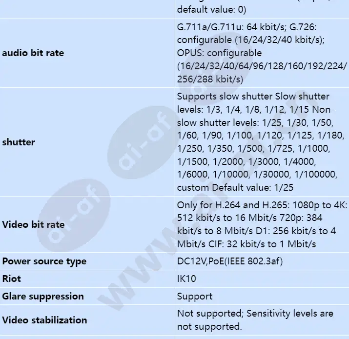 Support 1 TOPS computing power; Support behavior analysis, target, human body; Adopt 1/2.7" CMOS; 120dB super wide dynamic, strong contrast scene to restore true details; Chip Hi3516DV300 Computing power 1 TOPS RAM DDR3 0.2500 GB Flash SPI NAND FLASH 256.0 MB Sensor maximum image size 2MP 1920(H)*1080(V) Sensor photosensitive surface size 1/2.7" CMOS Minimum illumination Color: 0.002 lux (F1.2, AGC ON, 1/30s shutter speed); B/W: 0.0005 lux (F1.2, AGC ON, 1/30s shutter speed) or 0 lux (infrared illuminator enabled) Lens focal length 2.8-12mm Camera angle Horizontal: 36° (T) to 94° (W); vertical: 20° (T) to 50° (W) Infrared light fill distance 30m Video Encoding Format MJPEG/H.264/H.265 Audio encodingformat G.711a/G.711u/G.726/OPUS Behavior analysis Fast movement/Tripwire