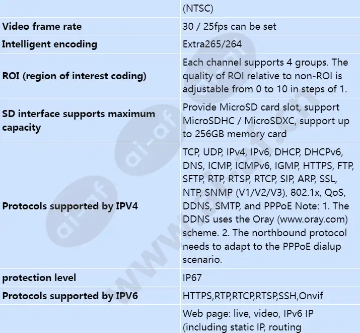 Support 1 TOPS computing power; Support heat map, behavior analysis, crowd situation analysis, face, human body; Adopt 1/2.7" CMOS; 120dB super wide dynamic, strong contrast scene to restore true details; Chip Hi3516DV300 Computing power 1 TOPS RAM DDR3 0.2500 GB Flash SPI NAND FLASH 256.0 MB Sensor maximum image size 2MP 1920(H)*1080(V) Sensor photosensitive surface size 1/2.7" Minimum illumination Color: 0.002 lux (F1.6, AGC ON); B/W: 0.001 lux (F1.6, AGC ON) or 0 lux (infrared illuminator enabled) Lens focal length 6mm Camera angle Horizontal: 54°; Vertical: 29.° Infrared light fill distance 30m Video Encoding Format MJPEG/H.264/H.265 Audio encodingformat G.711a/G.711u/G.726/OPUS Heat map Support Behavior analysis Fast movement/Tripwire crossing/Intrusion/Area entry or exit/Loitering