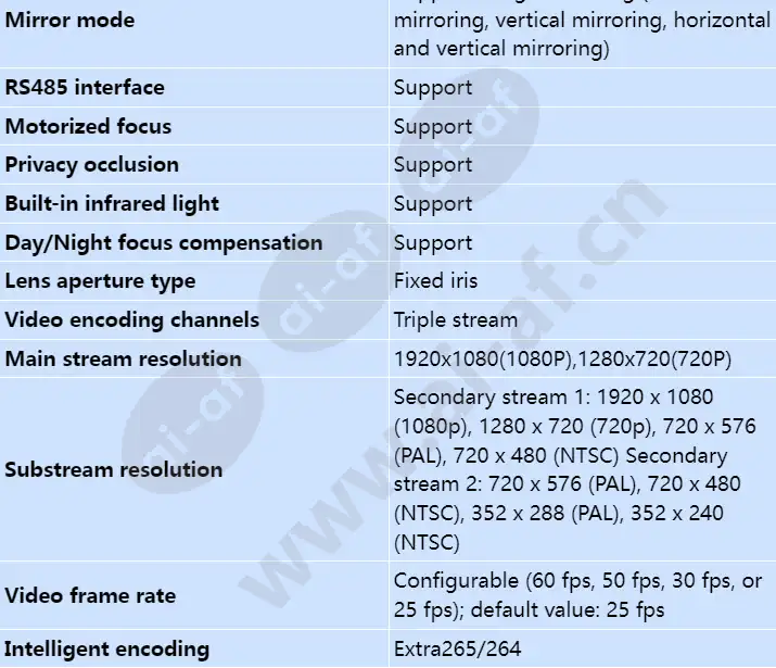 Support 1 TOPS computing power; Support behavior analysis, target, human body; Adopt 1/1.8" CMOS; 120dB super wide dynamic, strong contrast scene to restore true details; Chip Hi3516DV300 Computing power 1 TOPS RAM DDR3 0.2500 GB Flash SPI NAND FLASH 256.0 MB Sensor maximum image size 2MP 1920(H)*1080(V) Sensor photosensitive surface size 1/1.8" CMOS Minimum illumination Color: 0.001 lux (F1.2, AGC ON, 1/30s shutter speed); B/W: 0.0001 lux (F1.2, AGC ON, 1/30s shutter speed) or 0 lux (infrared illuminator enabled) or 0 lux (infrared illuminator enabled) Lens focal length 2.8-12mm Camera angle Horizontal:42°(T) to 95.5°(W);Vertical:24°(T) to 52°(W) Infrared light fill distance 30m Video Encoding Format MJPEG/H.264/H.265 Audio encodingformat G.711a/G.711u/G.726/OPUS Behavior analysis Fast