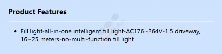Fill light-all-in-one intelligent fill light-AC176~264V-1.5 driveway, 16~25 meters-no-multi-function fill light Anti-corrosion level Class C Fill light type All-in-one smart fill light Peak power 1KW (flashing peak value) Net weight 5.8kg Operating temperature -40°C~60°C Flash spacing (s) 67ms Light supplementdistance 16~25m Certification GA/T 1202-2022 Gross weight 6.7kg Ingress Protection Rating IP65 Product dimensions 452*279*279mm Maximum fill light range Single lane Average power 40W Packing dimensions 540*350*355mm Application scenario Applicable to ITS intelligent traffic scene Operating Voltage AC176V~264V Way of working Capacity